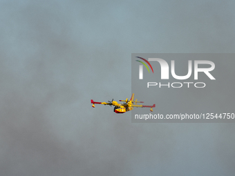 A Canadair CL-415 flies through smoke during aerial firefighting operations near Otranto, in the southern region of Puglia, Italy, on July 10, 2025. -The blaze, fueled by strong maestrale winds, scorched over 150 hectares of vegetation along the Adriatic coast. Two Canadairs and ground crews from the Fire Brigade, Civil Protection, ARIF, and the Air Force were dispatched to extinguish it.