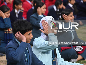 Students participate in a group meditation at Khulamanch on World Meditation Day in Kathmandu, Nepal, on December 21, 2025. The historic public ground, long used for civic gatherings and protests, is renovated and reopened to the general public.