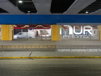 A street-level view of a bus stop at Rathaus Essen (Town Hall Essen) is located beneath the elevated railway and road structure in Essen, North Rhine-Westphalia, Germany, on August 2, 2025.