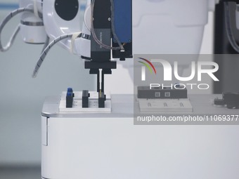 A nanoscale microfluidic droplet manipulation robot is demonstrating the process of cell capture and sample pre-processing with a fully automatic single-cell proteome analysis platform at the Hangzhou International Science and Innovation Center of Zhejiang University in Hangzhou, Zhejiang Province, China, on March 7, 2024.