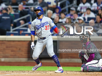 Los Angeles Dodgers' Teoscar Hernandez #37 hits a pitch for a double during the fourth inning of a baseball game against the New York Mets at Citi Field in Corona, N.Y., on May 25, 2025.