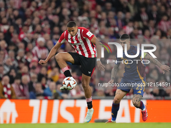 Maroan Sannadi central midfield of Athletic Club and Spain and Gianluca Mancini centre-back of Roma and Italy compete for the ball during the UEFA Europa League 2024/25 Round of 16 Second Leg match between Athletic Club and AS Roma at Estadio de San Mames on March 13, 2025 in Bilbao, Spain.