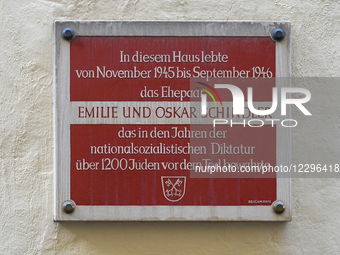 A commemorative plaque is mounted on the wall at Watmarkt 5 in Regensburg, Upper Palatinate, Bavaria, Germany, on April 19, 2025. It honors Emilie and Oskar Schindler, who live in this house from November 1945 to September 1946 and are credited with saving over 1,200 Jews during the Nazi dictatorship. Their actions are internationally recognized through Steven Spielberg's film ''Schindler's List.''