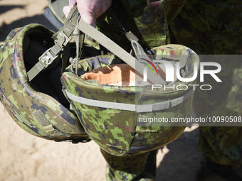Kevlar helmets are seen held by a soldier during a training exercise near Tapa, Estonia on 20 May, 2023. Estonia is hosting the Spring Storm NATO exercises involving over 13 thousand personnel with US, German, British, French and Polish forces training together with the Estonian Defence Forces (eDF).