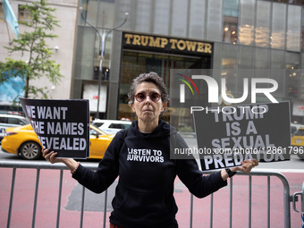 Protesters hold signs and read aloud testimony from Jeffrey Epstein's victims in front of Trump Tower in Manhattan, USA, on October 14, 2025. As part of the ''Expose the Epstein Files Day of Action'' in NYC, activists demand that President Donald Trump release all the Epstein files, calling for full transparency and accountability.