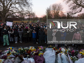 LONDON, UNITED KINGDOM - MARCH 13, 2021: People gather to pay respect and leave tributes at the bandstand on Clapham Common for Sarah Everard, who was kidnapped and murdered while she was walking home after visiting a friend over a week ago in Clapham area, on 13 March, 2021 in London, England. The Reclaim These Streets planned nationwide vigils for Sarah Everard have been cancelled due to lack of agreement with the police amid Covid-19 restrictions.