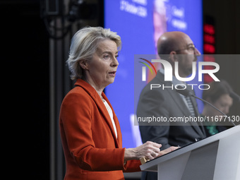 President of the European Commission Ursula von der Leyen at a joint press conference with President of the European Council Charles Michel President after the end of EU Council summit, the EU leaders meeting at the headquarters of the European Union in Brussels, Belgium on October 17, 2024. The EU leaders adapted the common conclusion, with topics discussed earlier about the war in Ukraine, the conflict in the Middle East, respecting international law and UN chart, in addition to topics related to migration and speeding up the return process, additional measures, the block's economy competitiveness and foreign affairs.