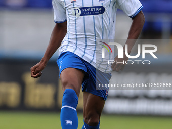 Sam Folarin of Hartlepool United participates in the pre-season friendly match between Hartlepool United and Leeds United at Victoria Park in Hartlepool, United Kingdom, on July 26, 2025.