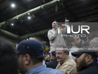 Mohammad Bagher Ghalibaf, the Parliament speaker, former mayor of Tehran, former commander of the Islamic Revolutionary Guard Corps (IRGC) air force, and Iran's early presidential elections candidate, is speaking to his supporters during his last electoral campaign rally at a sports complex in downtown Tehran, Iran, on June 26, 2024. Iranians are casting their votes to elect the new President of Iran on June 28.