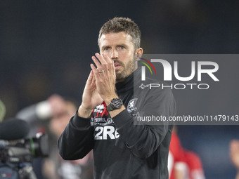 Middlesbrough Manager Michael Carrick is applauding the travelling support at the end of the Carabao Cup match between Leeds United and Middlesbrough at Elland Road in Leeds, England, on August 14, 2024.