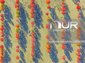 Farmers feed crabs under Metasequoia at the Sihong County Ecological Breeding Base in Suqian City, Jiangsu Province, China, on November 19, 2025.
