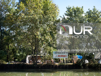 A general view of the ZAD against the LGV project on the Canal du Midi banks near Toulouse. Zadists (development protesters) begin to install a ZAD (Zone to Defend, a militant occupation intended to physically blockade a development project) along the Canal du Midi, a UNESCO World Heritage Site. They intend to block the construction of a new high-speed train line between Toulouse and Bordeaux. 'Ecureuils' (people living in trees, nicknamed 'squirrels') already live in some trees near the Canal du Midi. However, there are already two train lines between Bordeaux and Toulouse. The projected cost of the project is EUR14 billion. The works and the line will use more than 6,300 hectares of good soils, including 3,000 hectares of forests and 370 hectares of wetlands. This takes place in Toulouse, France, on October 4, 2024.