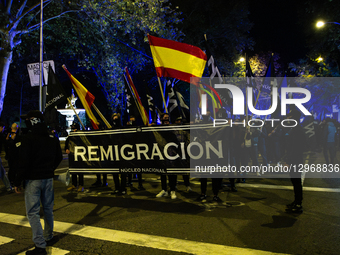 Around 700 supporters of the far-right group Nucleo Nacional march through central Madrid, Spain, on November 8, 2025, from Paseo del Prado toward the Spanish Congress, chanting nationalist and anti-immigration slogans. The demonstration, held under heavy police surveillance, ends with clashes as riot officers charge to disperse the crowd and detain three participants. The group, which promotes ultranationalist and xenophobic ideas, gains attention for attracting young sympathizers and reviving Francoist symbols in its rallies.