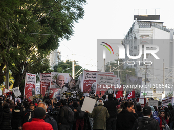 Demonstrators raise large banners featuring portraits of imprisoned prominent opposition figures, including Ahmed Nejib Chebbi and Ayachi Hammami, during a mass march that brings together thousands of supporters of opposition parties across the political spectrum, human rights and civil society activists, and ordinary Tunisians, in Tunis, Tunisia, on December 6, 2025, to protest under the banner ''Opposition Is Not A Crime.'' They decry what they call a growing crackdown on President Kais Saied's critics and opposition parties, as well as on civil liberties, individual rights, freedom of expression, and press freedom. Participants denounce what they describe as an increasingly authoritarian and dictatorial one-man rule by the Tunisian president. The crowd expresses solidarity with opposition figures imprisoned in connection with the case known as the ''conspiracy against state security,'' demanding their release. Under President Kais Saied's rule since 2021, Tunisia sees the dissolution of parliament, the dismissal of the government, the adoption of a new constitution, the dismissal of dozens of judges, the arrest of political opponents, critics, and journalists, while the activities of dozens of organizations are suspended.