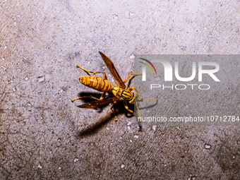 Yellow paper-wasp (Polistes olivaceus) or Tattaiyas is known for its intriguingly vivid yellow coloration, an uncommon characteristic among wasp species. Their unique thermal regulatory system allows them to thrive in varying climates. Yellow paper wasps contribute significantly to the ecosystem through their role as pollinators and as prey on certain insect pests. Moreover, their complex social structures showcase some of the animal kingdom's most fascinating manifestations of cooperative behavior. They are about 18 to 25mm long wasps that gather fibers from dead wood and plant stems, which they mix with saliva, and use to construct water-resistant nests made of gray or brown papery material. Paper wasps are also sometimes called umbrella wasps, due to the distinctive design of their nests. The Yellow paper-wasp bites humans actively and has special defensive behaviors that can trigger toxic reactions or allergic reactions. If there are serious reactions, seek immediate medical attention. This photo was taken at Tehatta, West Bengal; India on 28/10/2023.