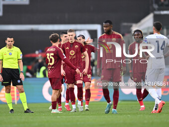 Artem Dovbyk of A.S. Roma scores the goal for 1-0 during the 29th day of the Serie A Championship between A.S. Roma and Cagliari Calcio at the Olympic Stadium in Rome, Italy, on March 16, 2025.