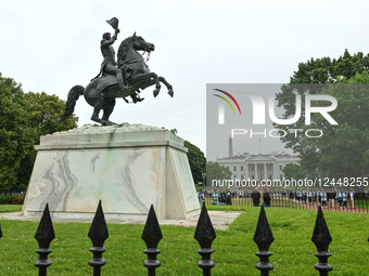 WASHINGTON, DC - MAY 27: The statue of General Andrew Jackson stands at Lafayette Square, with the White House visible in the background, in Washington, District of Columbia, May 27, 2025.
