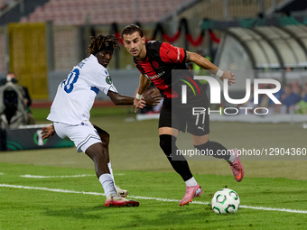 Merlin Hadzi of Hamrun Spartans is closely followed by Gaoussou Diakite of Lausanne-Sport during the UEFA Conference League league phase match between Hamrun Spartans FC and FC Lausanne-Sport at the National Stadium in Ta' Qali, Malta, on October 23, 2025.