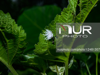 A Coccinellidae (ladybug) larva carries a Camponotus parius ant in its mouth in a forested area near Tehatta, West Bengal, India, on June 16, 2025