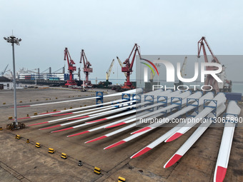 A cargo ship loaded with wind power equipment prepares to be shipped abroad at the dock in Lianyungang, Jiangsu Province, China, on December 7, 2025.