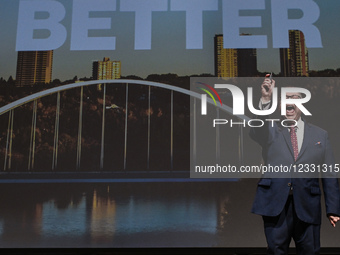 EDMONTON, CANADA - MAY 3: Naheed Nenshi, leader of the Alberta New Democratic Party, addresses delegates and supporters during the 2025 Alberta NDP convention at the Convention Centre in Edmonton, Alberta, Canada, on May 3, 2025. Nenshi received 89.5% support in a leadership review vote, as party members also approved a motion to allow opting out of federal NDP membership; in his speech, he addressed topics including healthcare, education, the economy, and Alberta separatism.