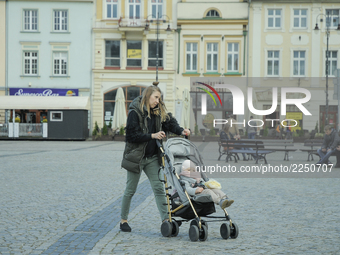 A young woman is seen walking with a child in a stroller on the Old Market Square on October 8, 2017 in Bydgoszcz, Poland.
