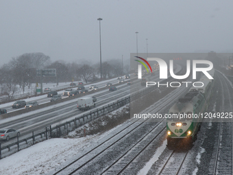 Traffic moves slowly on a snow-covered highway in Toronto, Canada, on February 12, 2025. The city is under a snowfall warning, with expectations of 15 to 25 centimeters of snow by Thursday morning. Residents are advised to exercise caution and consider postponing non-essential travel.