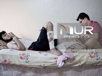 Nadim is a fighter of the Free Army. Already wounded in the head and arm last year, he was hit by a shell about 2 months ago. The doctors had to amputate the of one of his legs. Fighting in the KATIBA, Aasifat Al Shamaal (storm North), he was hit by a bombing near the Azaz. True pride of his family, he has to leavewhen his combat injuries will get better. He is aged 23 years. Photo: Michael Bunel/NurPhoto