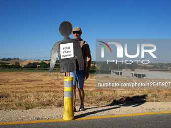 A man places a black figure along the RD20 that reads 'Polo, 59yo, worker'. Opponents of the planned A69 highway gather in Verfeil, Haute-Garonne, on July 11, 2025, to protest against the closure of the RN126 for 6 to 9 months due to the planned A69 highway. The works on the planned A69 cause the normal road, the RN126, to close, and traffic diverts to the RD20. The RD20 is in front of a future school and is a very narrow road where it is very dangerous for heavy trucks to pass each other. The RN126 road is already cut off, and the traffic is diverted to the RD20, but in a week, two accidents occur. Parents fear their children or passersby could be injured or killed. Protesters place black figures along the road to raise awareness about the dangers on this small RD20.