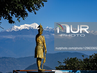 Mountain ranges are seen with the statue of Prithvi Narayan Shah from Chandragiri Hill, which reopens today after the Genz protest, on the outskirts of Kathmandu Valley, Nepal, on November 8, 2025. Chandragiri Hill, a popular tourist destination, offers panoramic views of the valley and surrounding hills.