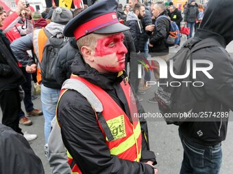 An employee of the French state owned railway company SNCF wearing a railroad employee’s cap demonstrates in front of the Gare de l’Est railway station in Paris on March 22, 2018 to protest against French government's string of reforms. Thousands of French train drivers, teachers and air traffic controllers were set to go on strike on March 22, 2018 in a major day of protest against French President's reform drive. The walk-outs and demonstrations are the latest test of strength for the 40-year-old centrist leader as he pushes ahead with a new phase of his agenda to overhaul the state railways and other public services.