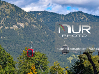The Eckbauerbahn monocable gondola lift carries passengers between the Olympic Ski Stadium in Garmisch-Partenkirchen and the Eckbauer mountain at 1,237 meters in Garmisch-Partenkirchen, Bavaria, Germany, on September 14, 2025. The detachable gondola cabins provide year-round access for hikers, skiers, and tourists.