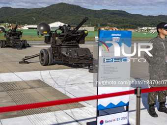 A KM167A3 20mm towed anti-aircraft gun (Vulcan) is displayed during the Seoul International Aerospace and Defense Exhibition (ADEX 2025) at Seoul Air Base in Seongnam, Gyeonggi Province, South Korea, on October 17, 2025. The eight-day event, running through October 24 at both Seoul Air Base and KINTEX in Ilsan, features more than 600 companies from 35 countries presenting cutting-edge aerospace and defense technologies.