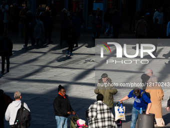 A general view shows people walking with longer shadows in front of Cologne Central Station in Cologne, Germany, on March 17, 2025.