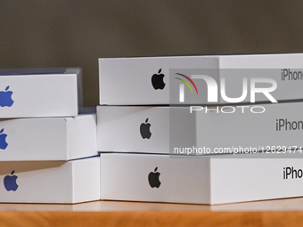 EDMONTON, CANADA – AUGUST 5: Boxes of Apple iPhone 13 and the latest iPhone 16 series displayed in Edmonton, Alberta, Canada, on August 5, 2025.