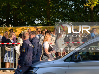 Police officers stand by with explosives detection dog units as security operations continue following a bomb threat at the Oktoberfest grounds in Munich, Bavaria, Germany, on October 1, 2025. Special vehicles equipped for detection dogs are deployed near festival entrances.