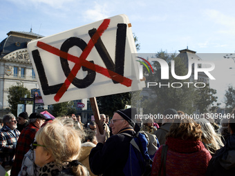 An opponent holds a placard that reads 'Protect us against the LGV'. Several associations, such as 'Amis de la Terre' ('Friends of Earth'), Stop-LGV 47, Stop-LGV 33, and LGV-No Thanks, call for a gathering in front of the main railway station of Toulouse, the Matabiau train station, just before a hearing at the Administrative Court of Toulouse to contest the legality of environmental authorizations for the planned high-speed train between Bordeaux and Toulouse. The CNPN (National Council for the Protection of Nature) says the SNCF file to build this high-speed railway is inadequate, false, and incomplete. The Environmental Authority also says there is no research on alternatives for the LGV, which is a legal duty. Moreover, the projected price tag is initially estimated at EUR10bn for 200 km, then EUR14bn in 2021, and now the costs are estimated to exceed EUR20bn. The EU will not provide any funding. However, there are already two train lines between Bordeaux and Toulouse. The works and the line will use more than 6,300 ha of good soils, including 3,000 ha of forests and 370 ha of wetlands. This takes place in Toulouse, France, on December 15, 2025.