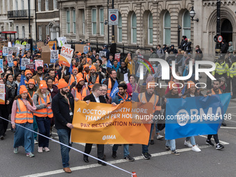 LONDON, UNITED KINGDOM - APRIL 11, 2023: Junior doctors and their supporters march through central London as members of the British Medical Association take part in a four-day strike action over pay in London, United Kingdom on April 11, 2023. Over 61,000 junior doctors in England are taking part in the strike action demanding immediate pay restoration to reverse the real-term, inflation-driven cuts of 26% since 2008.