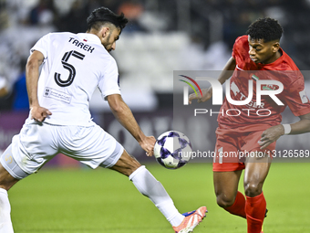 Tarek Salman of Al Sadd SC and Yahya Ali Alghassani of Shabab Al Ahli are in action during the AFC Champions League elite west football match between Qatar's Al Sadd SC and United Arab Emirates Shabab Al Ahli at Jassim Bin Hamad Stadium in Doha, Qatar, on December 23, 2025.