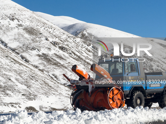 A snowplow clears freshly fallen snow against a backdrop of snowy hills in Campo Imperatore, Gran Sasso d'Italia, Italy, on November 16, 2024.