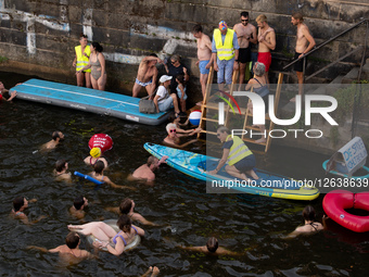 People attend a demonstration in front of the Humboldt Forum and by the Schlossbruecke, asking to revert a law from 1925 that prohibits swimming in the Spree River in Berlin, Germany, on August 12, 2025.