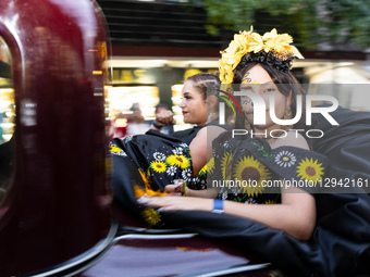 Participants take part in the annual Day of the Dead parade in Mexico City, Mexico. Dia de los Muertos, rooted in Indigenous Mexican and ancient Aztec influences, honors deceased loved ones with altars, marigolds, candles, sugar skulls, and offerings meant to guide returning spirits. The multiday celebration includes parades, family gatherings, cemetery visits, and rituals that blend remembrance with festive cultural expression.