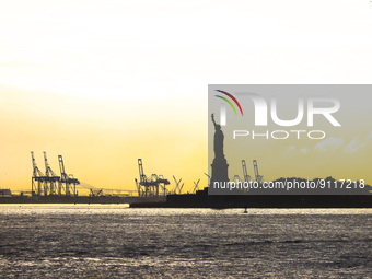 A silhouette of the Statue of Liberty on Liberty Island is seen from a distance in New York, United States, on October 25, 2022. The copper statue, a gift from the people of France to the people of the United States, was designed by French sculptor Frederic Auguste Bartholdi and its metal framework was built by Gustave Eiffel.