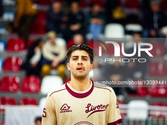 Niccolo Filoni (ITA) of Bi.Emme Service Libertas Livorno plays during the Italian Championship Basket Old Wild West Serie A2 Season 2024-2025 match between Real Sebastiani Rieti and Bi.Emme Service Libertas Livorno in Rieti, Italy, on December 14, 2025, at PalaSojourner.