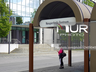 A boy runs toward the entrance of the Neuperlach Zentrum subway station beneath a glass canopy in Munich, Bavaria, Upper Bavaria, Germany, on May 24, 2025. The station features escalators and digital bus departure boards, serving as a local transit hub connecting U-Bahn and bus lines.