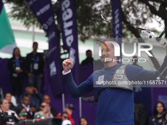 Marcus D'Almeida of Brazil competes against Matias Grande of Mexico (not in picture) during the Men's recurve 3rd place match on the final day of the Tlaxcala 2024 Archery World Cup Final. Marcus D'Almeida beats Matias Grande 6-2 in Tlaxcala, Mexico, on October 20, 2024.