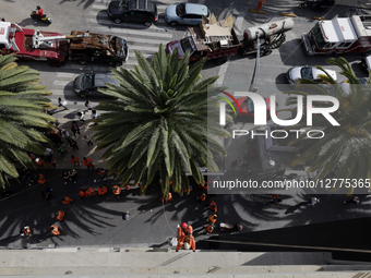 Topos Azteca rescuers rappel down a building in Mexico City, Mexico, on September 19, 2025, during the Second National Drill Mexico 2025, with the hypothesis of an 8.1 magnitude earthquake with an epicenter in Lazaro Cardenas, Michoacan; a hurricane in Campeche, Yucatan, Sonora, Quintana Roo, and Baja California Sur; an urban fire in Durango, Guanajuato, and Tamaulipas; and a tsunami in Baja California.