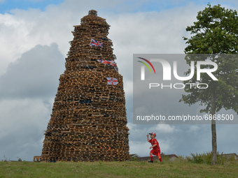 A typical loyalist bonfires made of 156 pallets tall and prepared for the 11th Night in Kilcooley, Bangor. The bonfire consists of pallets collected by the Loyalists to mark the opening of the annual Orange Parade on July 12. The parade celebrates the victory of the Protestant King William of Orange over the Catholic King James II at the Battle of Boyne in 1690. On Sunday, 11 July 2021, in Kilcooley, Bangor, County Down, Northern Ireland