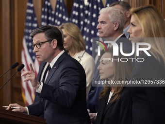 US House Speaker Mike Johnson speaks about the Day 37 Government Shutdown, the longest on record in US history, during a press conference in Washington DC, USA, on November 3, 2025, at 207-HOB/Capitol Hill.
