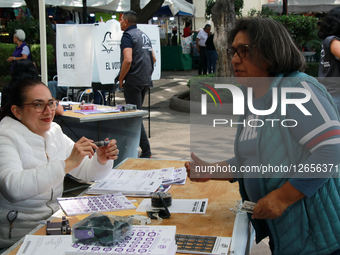 A woman votes during the Participatory Budget Consultation in the center of the Tlalpan Mayor's Office in Mexico City, Mexico, on August 17, 2025. With 2,427 opinion receiving tables installed in the 16 mayoralties of Mexico City, the 2025 Participatory Budget consultation is held this Sunday by the Electoral Institute of Mexico City (IECM), through which citizens choose the projects to change their neighborhoods.